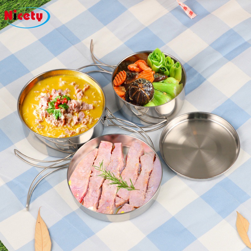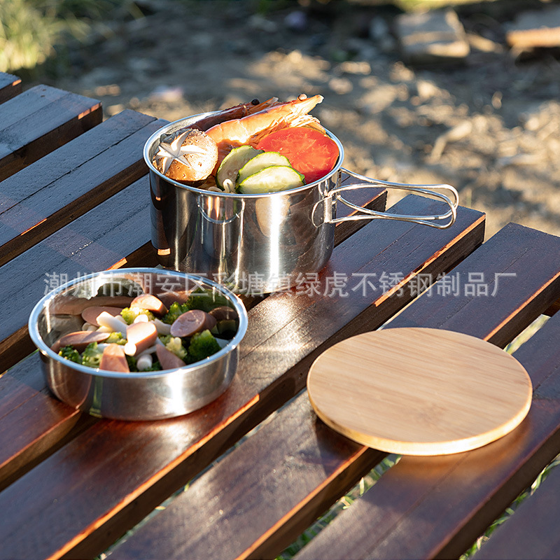 304ステンレス屋外キャンプ調理器具携帯弁当箱竹木蓋三点セットキャンプ鍋セット源工場