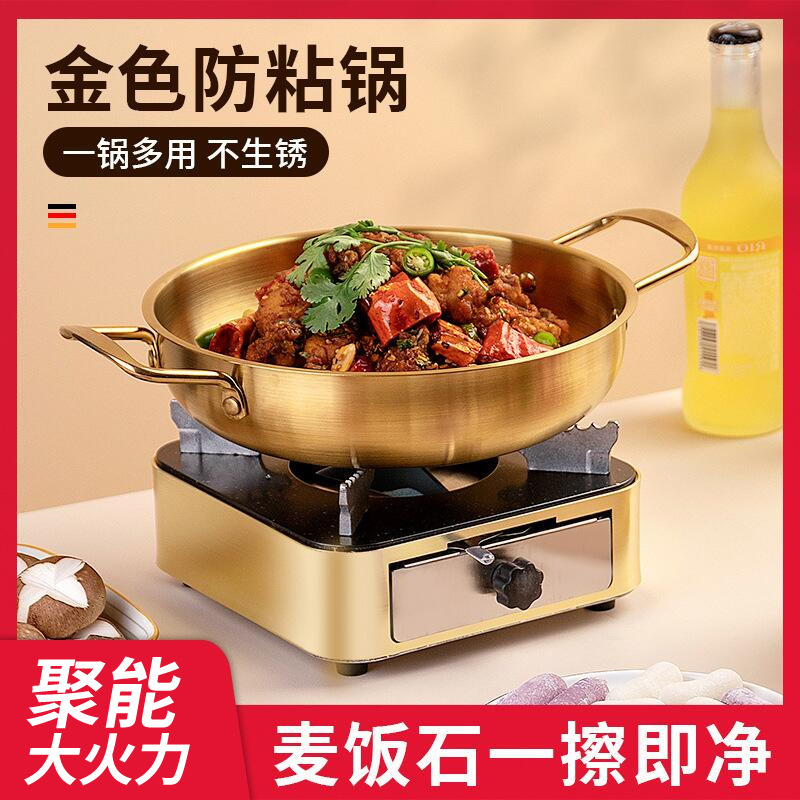 韓国製ステンレス製辛口シーフード鍋、金色の平底浅鍋、業務用両耳小フライパン