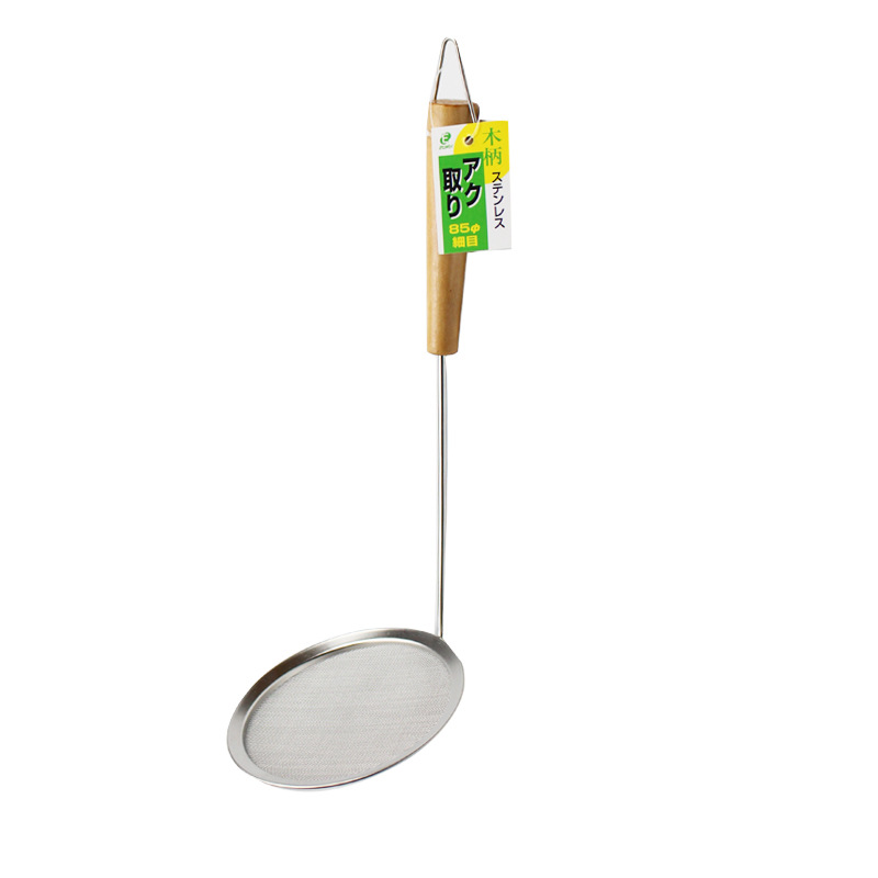 日本の輸入木の柄のステンレスの浮き泡のスプーンの細密な網の漏れのスプーンの鍋のスプーンのスキミングのスプーンの揚げ物の濾過網