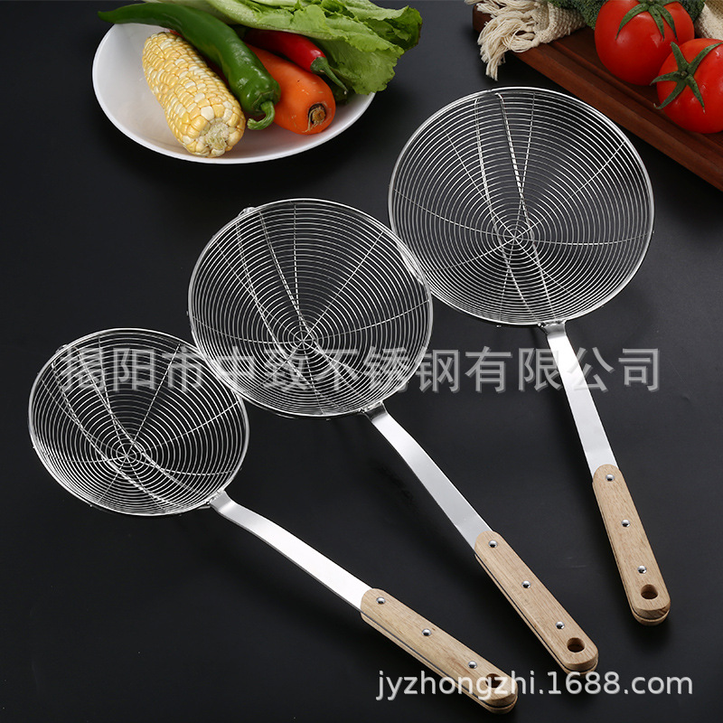 304ステンレスの大きいサイズのスプーンの木の柄の両耳の揚げ物のスプーンの家庭用料理の台所用品の面のネットをすくい取って濾過ネットを漏らします。