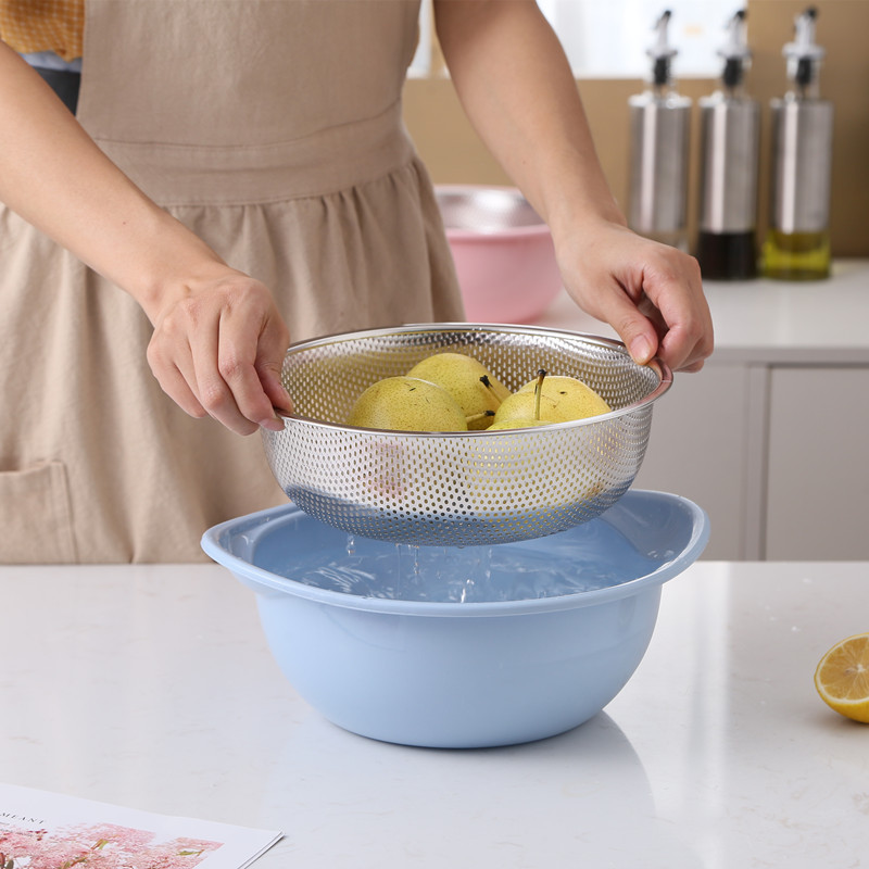 ステンレスの水たまりかごの米を洗うふるいセットの元宝のたらいのカラーのプラスチックのたらいの野菜のたらいの密な穴のかごの家庭用の米を洗うたらい