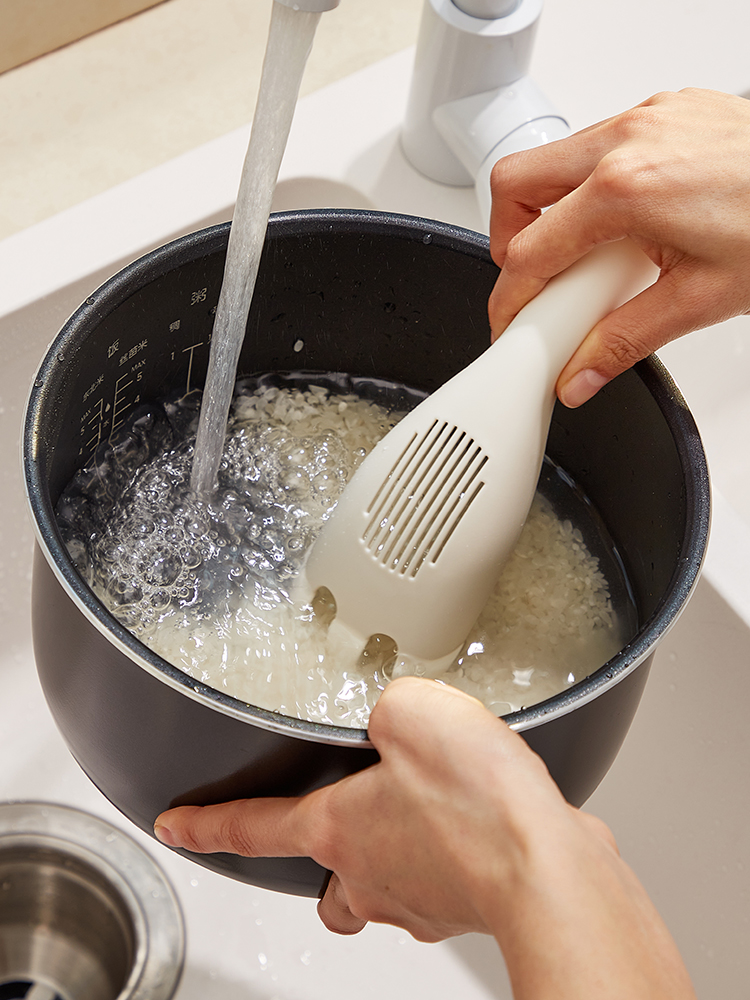 米を洗って米を研ぐスプーンを洗って米をふるいます。