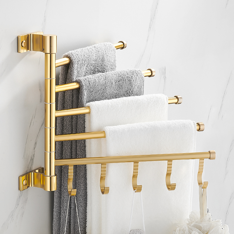 ゴールドタオルラック マルチロッド フック付き 浴室回転タオルバー ウォールコーナーダブルロッド パンチングなしのバスルーム収納ラック