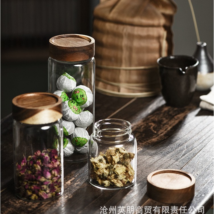高ホウ素シリコンガラス貯蔵タンクねじ口アカシア木蓋密封缶茶葉缶コーヒー豆雑穀収納缶
