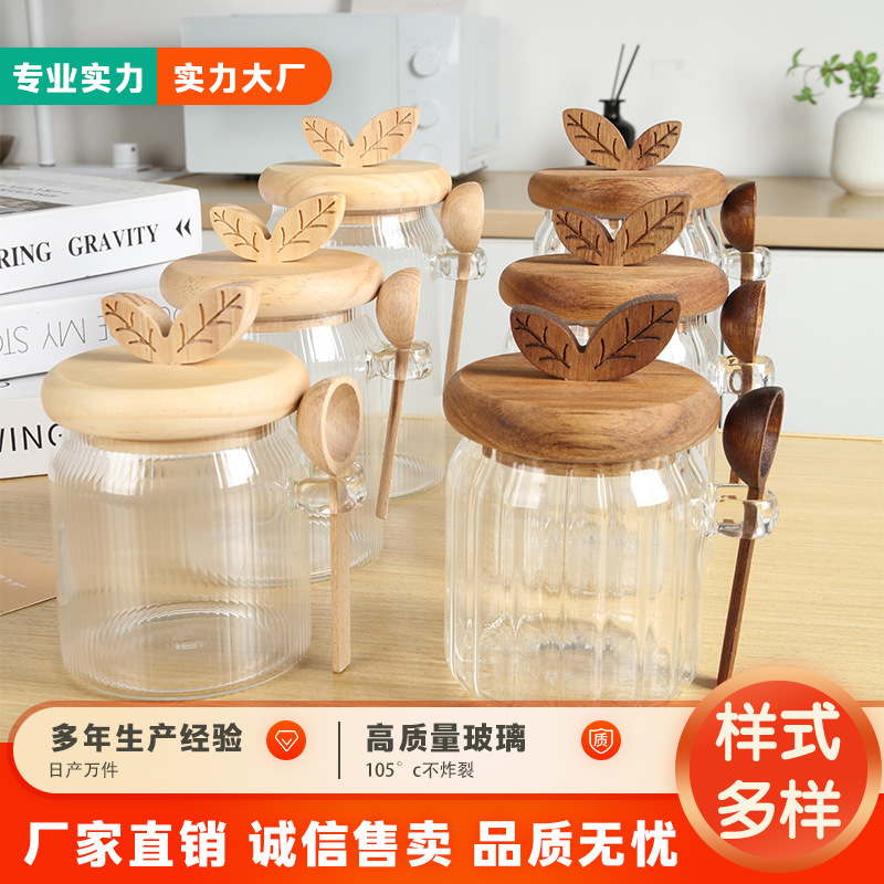 高ホウ素シリコンガラス木蓋貯蔵タンクスプーン付き食品ガラス密封タンク透明キッチン密封食品タンク