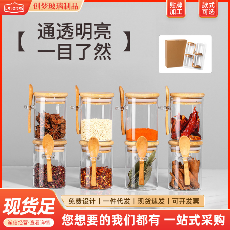 クリエイティブガラス収納缶円形スプーン付き木製蓋収納キッチン調味缶砂糖缶コーヒー豆保存缶