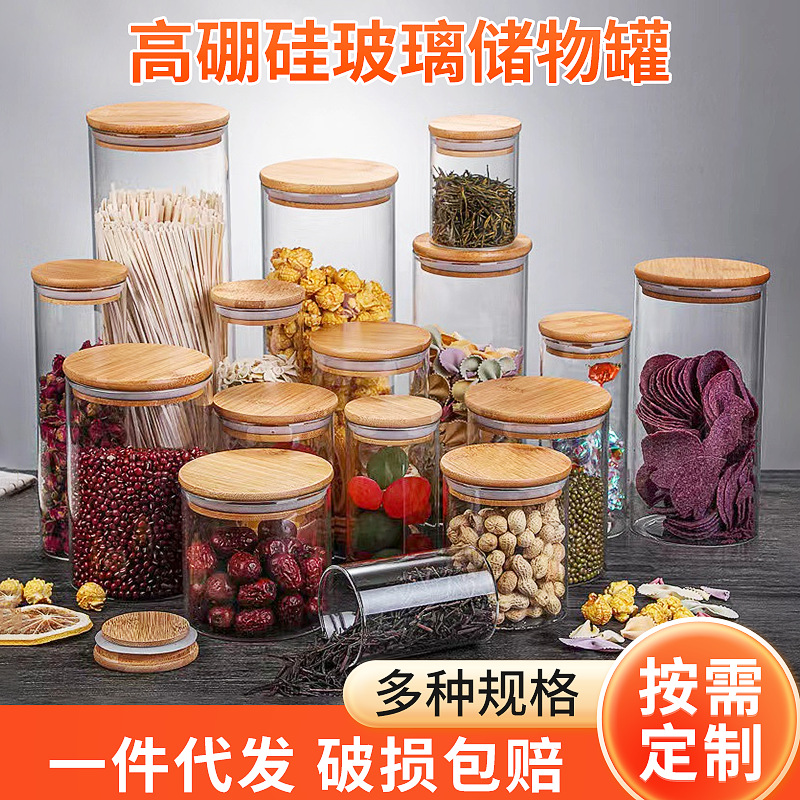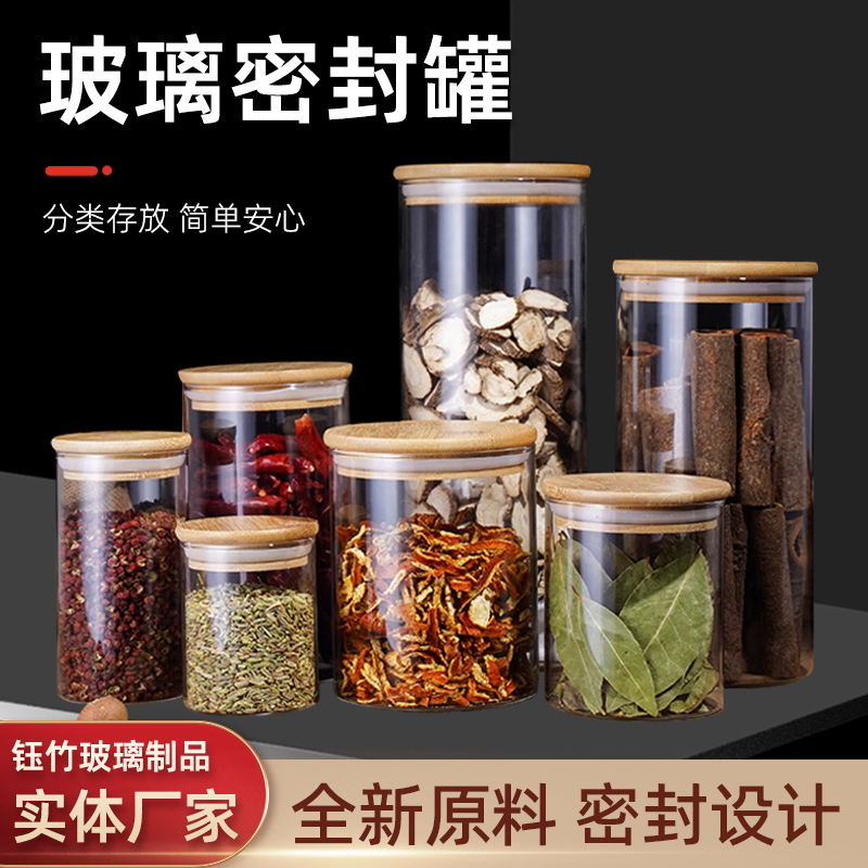 高ホウ素シリコンガラス収納缶竹蓋直筒茶大容量密封缶キッチン透明間食収納缶