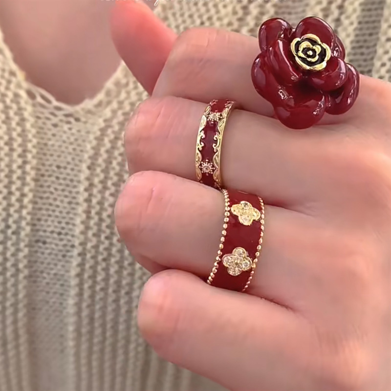 フランスのドリップオイルツバキの花ジルコンの指輪の赤い新年の雰囲気感があります。
