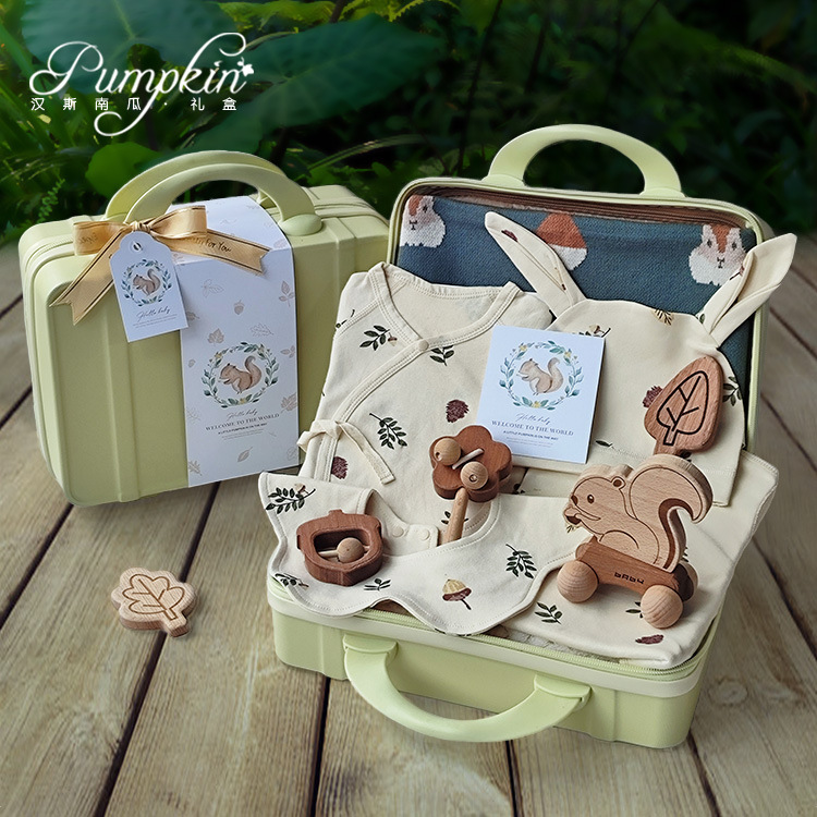 赤ちゃんのギフトボックスの赤ちゃんの男女のリスのスーツケースの服のセットの新しい木のおもちゃの純綿の贈り物の品物