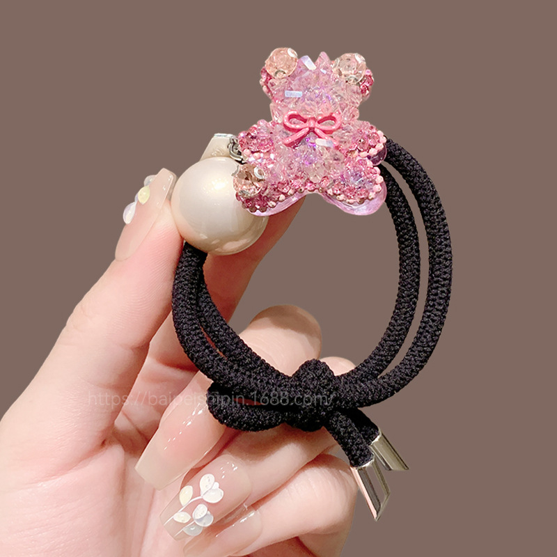 ライトラグジュアリーピンクベアパールクリスタルヘアロープデザインパール高弾性二重ヘアロープ耐久性のあるゴムバンド女性用