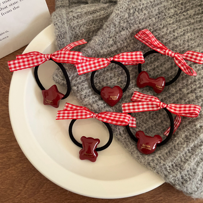新年の赤い格子の蝶結びの熊の愛の髪のひもの甘い少女の髪の筋の高弾性の髪飾り