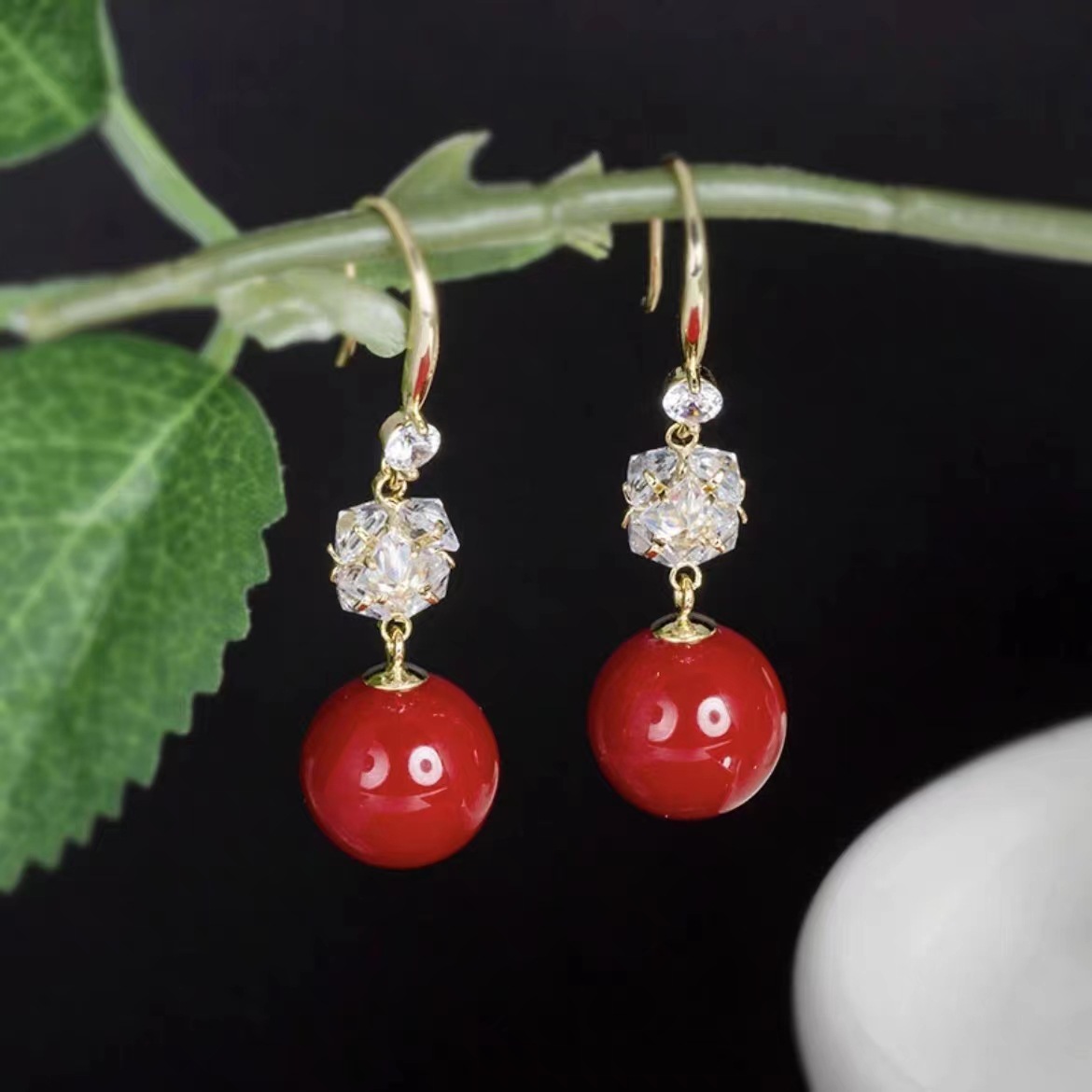 レトロなダイヤモンドの赤い真珠のイヤリングの女性のネットの赤い爆発の高級感の気質の小さい大衆のイヤリングの丸い顔はやせている耳飾りを現します。