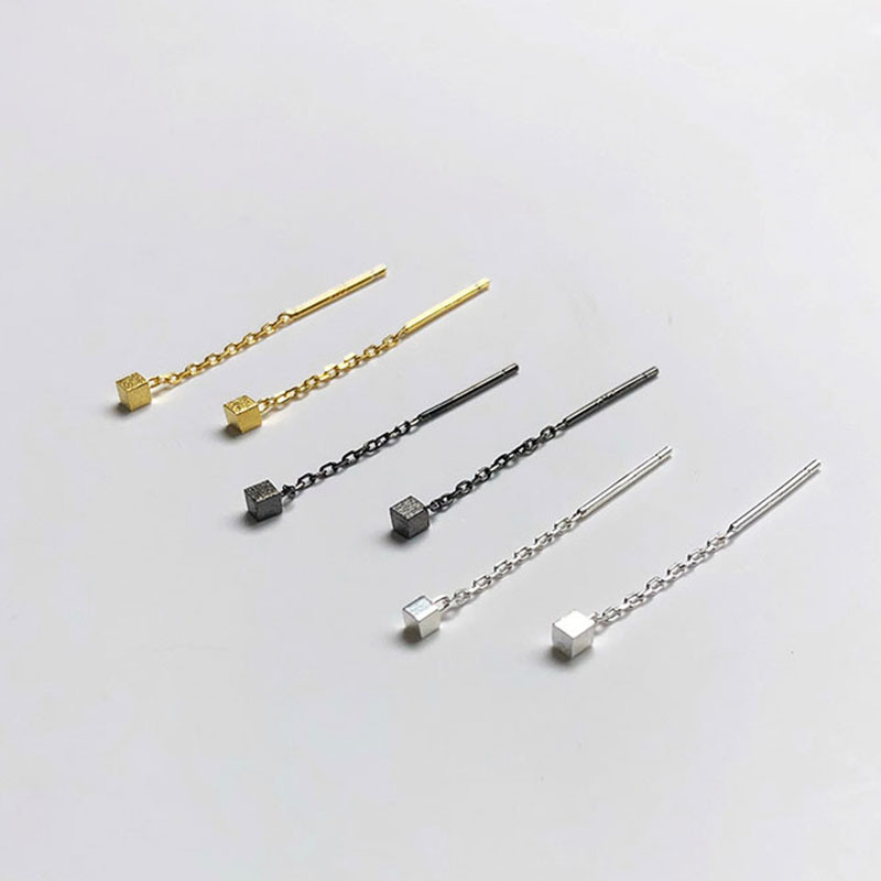 銀家925シルバー幾何学模様スクエアブラッシュドキューブイヤリング、丸顔向けロングイヤリング、細見えチェーン