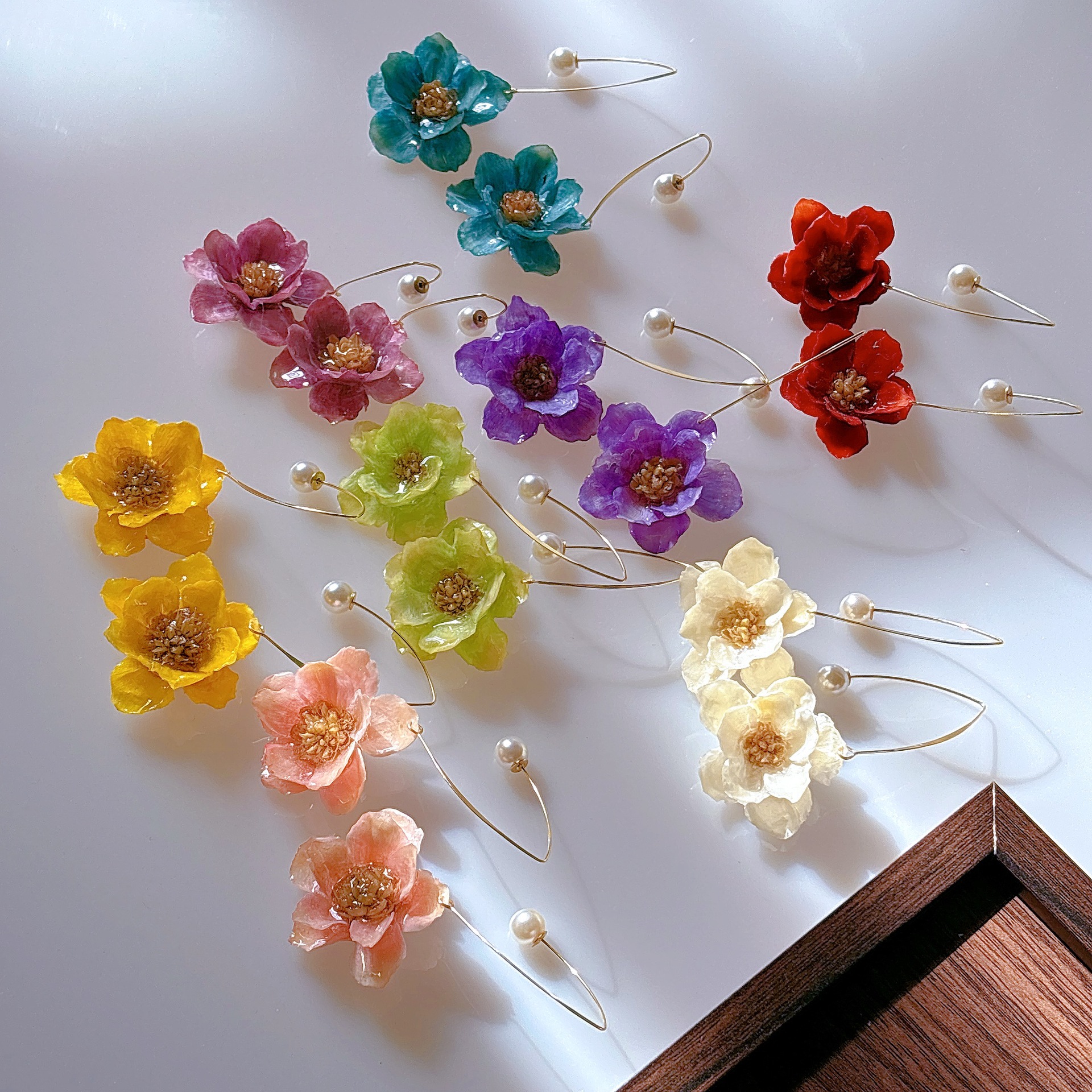 フォレストロマンチックで甘いマルチカラーの本物の花のイヤリング、エポキシローズフラワーイヤーフック、イヤリング、ガールフレンドへのギフト