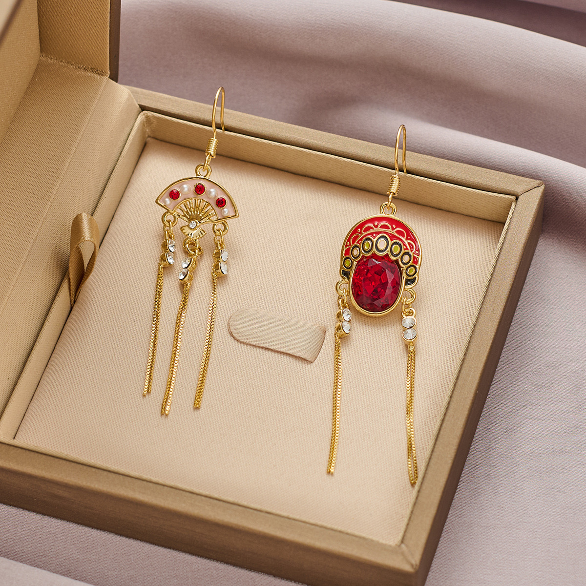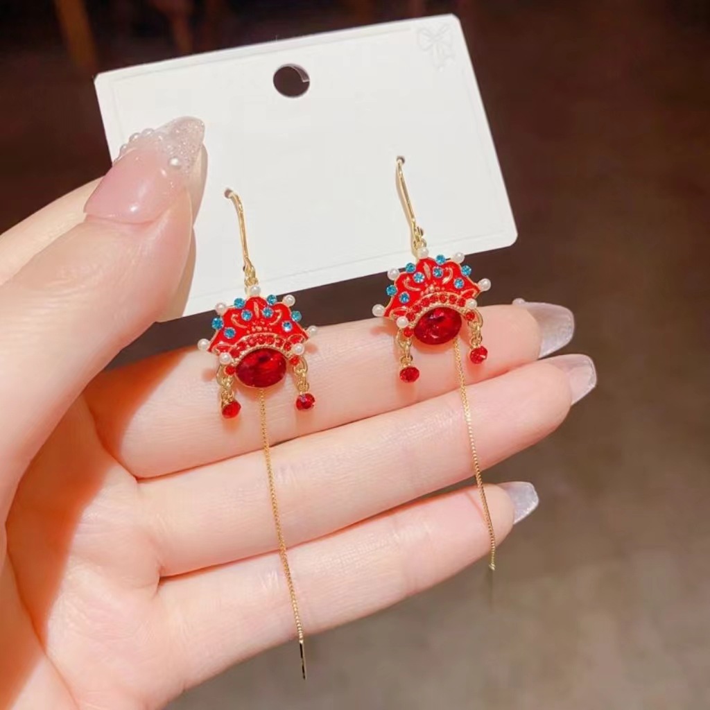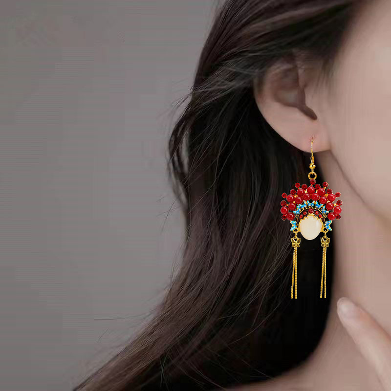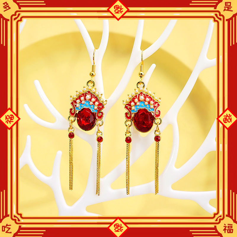 2024年の新型潮京劇の顔のイヤリングの古風な赤い長いタイプのフリンジの中国風の耳のイヤリングの女性