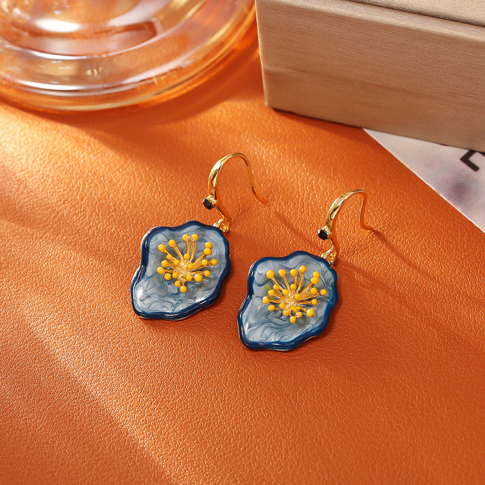 レトロなスタイルのハイエンドブルーオイルドリップイヤリングニッチデザイン不規則なイヤーフックエレガントな文学イヤリング