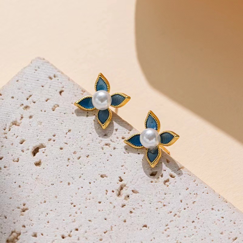 潮棋興シンプルエナメル工芸四葉花模造真珠ピアスデザイン日常装飾金メッキ気質漢服バッチ
