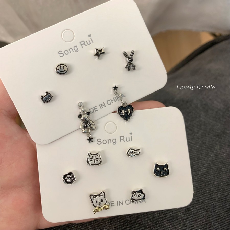 熊の星のペンダントの愛の猫の蝶結びの笑顔のピアスのセットの女性の長いタイプの非対称の甘いクールな耳飾り
