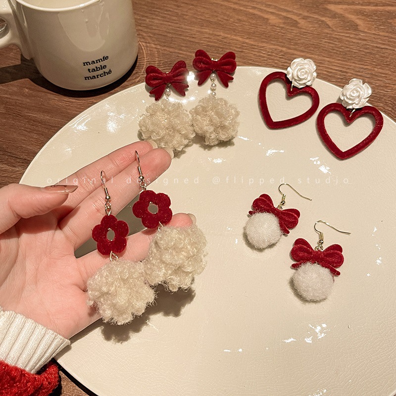 新作の赤い愛の毛玉のイヤリングの赤いベルベットのお祝いのイヤリングのイヤリングのイヤリングの蝶結びの愛のイヤリング
