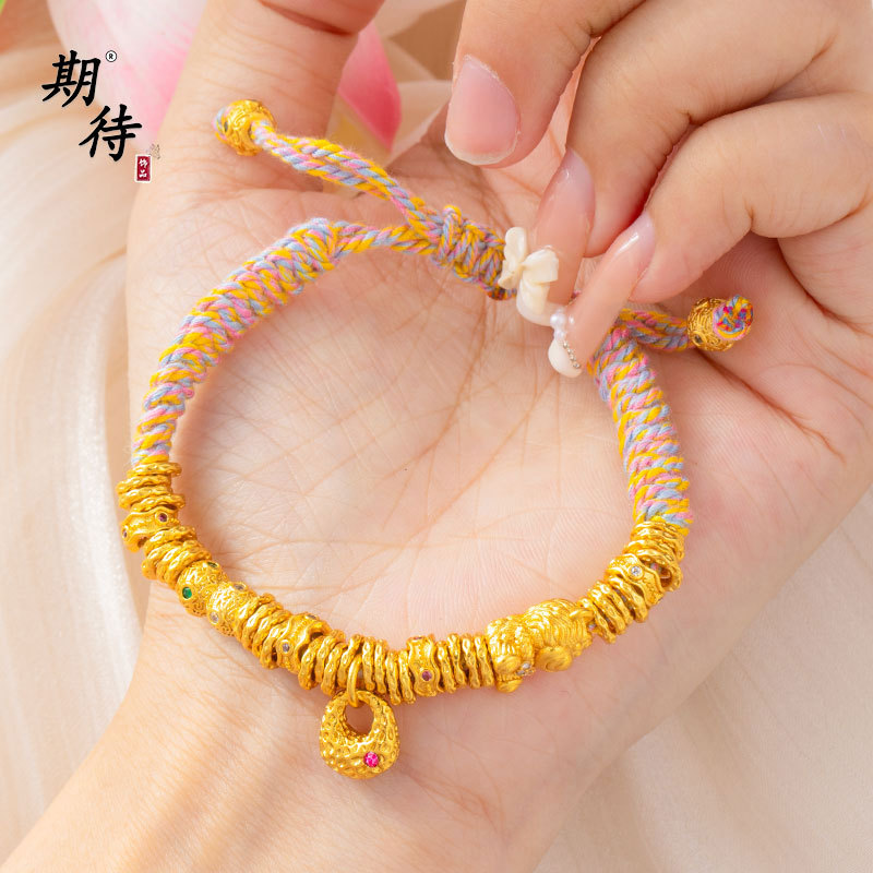 チベットスタイル DIY 手織りロープブレスレットホリデーブレスレットクマ愛ハンドジュエリーハンマーパターン小さなゴールドブロックブレスレット女性用