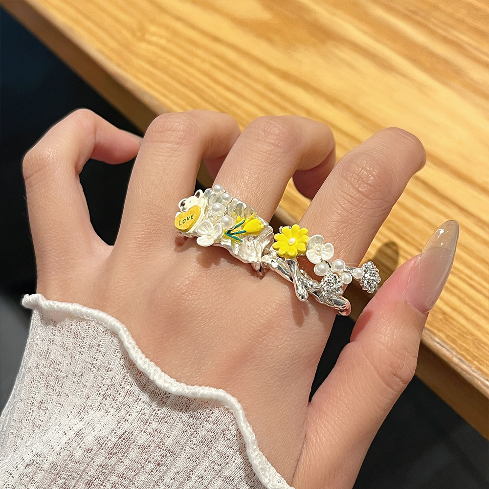 ドーパミンカラフルな小さなミルクベアオイルドリップラブデイジーフラワークラウドパールワイドバージョンスタッキングリング女性用