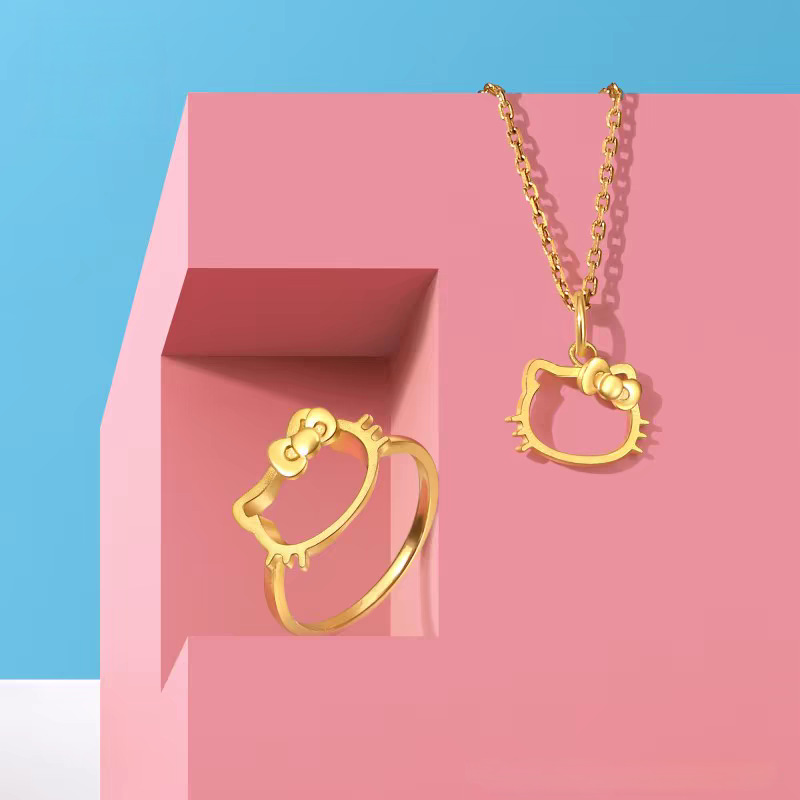 KT猫リング 小紅書同款 ベトナム産サファイアゴールド 漫画アニメ ケイティ猫 オープンリング ネックレスセット