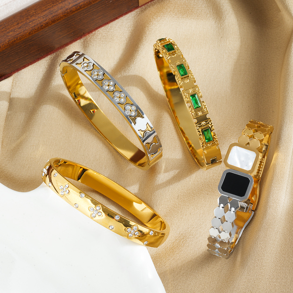 全身チタン鋼クロスボーダー新四つ葉のクローバー中空二色グリーンジルコニウムブレスレットライトラグジュアリースタイルハイエンド万華鏡ブレスレット