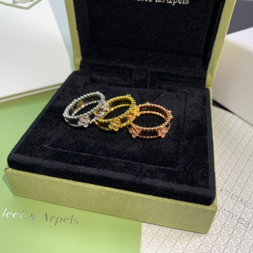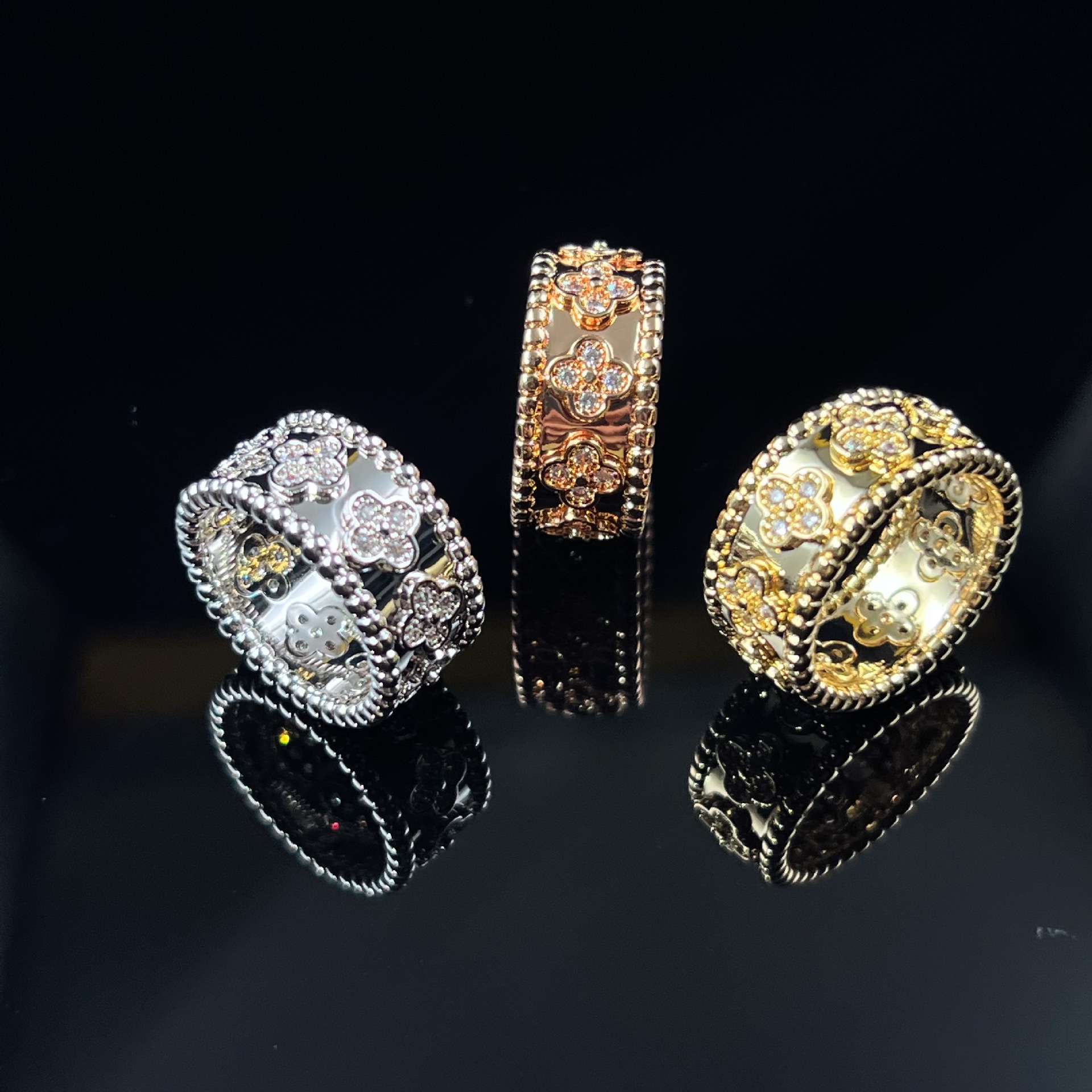 v ゴールドハイバージョン 18K ゴールドメッキ万華鏡リングワイドバージョン女性用四つ葉の花フルダイヤモンドハイエンドカップルリング