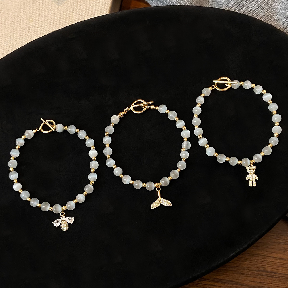 新中国風天然石猫眼石数珠手串ブレスレット熊蜂魚尾ペンダント