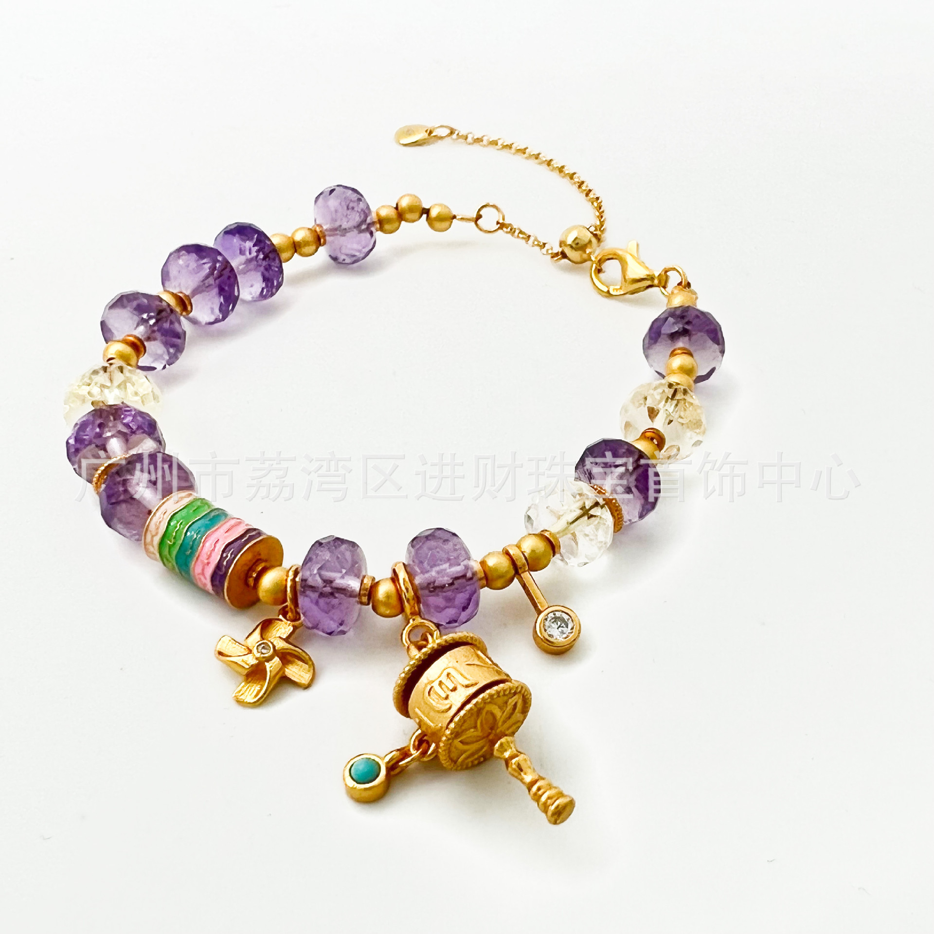 天然紫水晶招財黄水晶手串回転輪風車純銀金メッキ高品質気質優雅手飾り