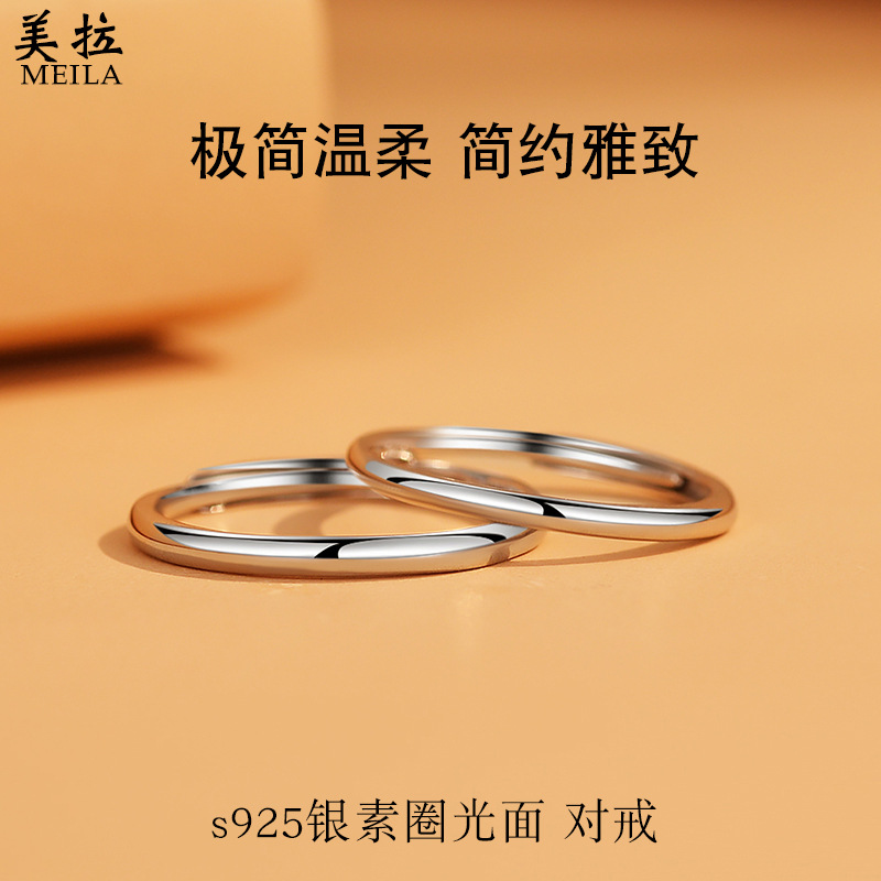 s925スターリングシルバー光沢プレーンリング、カップルリング、ニッチデザイン、クラシックなミニマリストリング、シンプルなオープンリングのペア