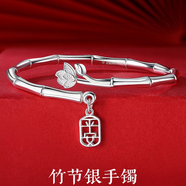 竹節銀ブレスレット女9999純銀小衆デザイン新中国式平安ペンダント蓮中実足銀ブレスレット