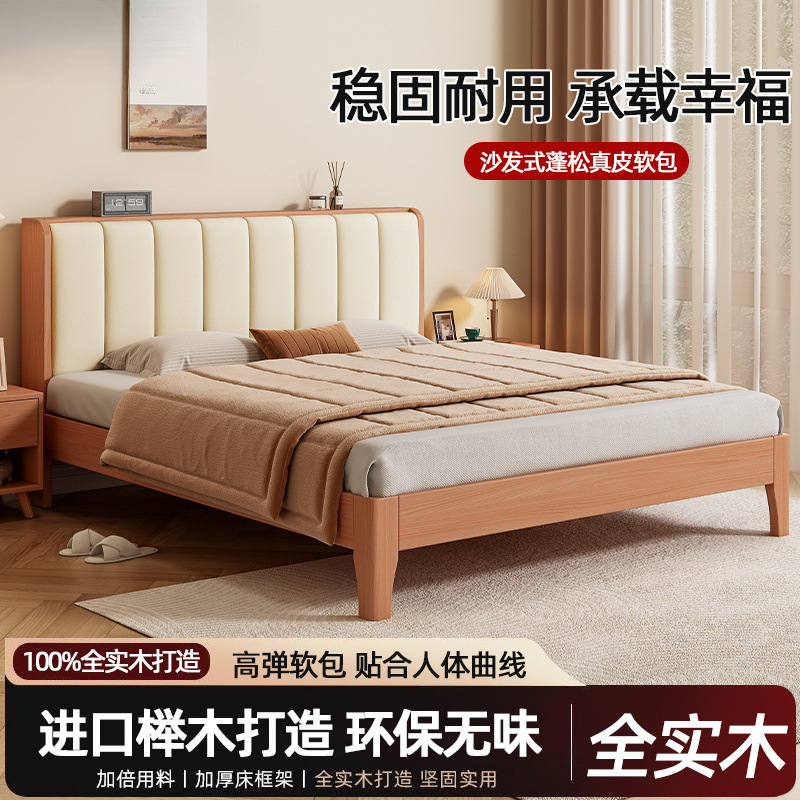 無垢材ベッド モダン シンプル マスターベッドルーム ダブルベッド 1.8m 子供用 1.2m ブナ材 小型ベッド 小型アパート 厚みのあるソフトバッグ付き