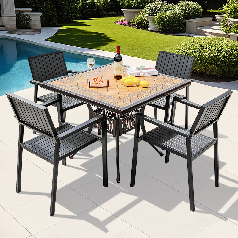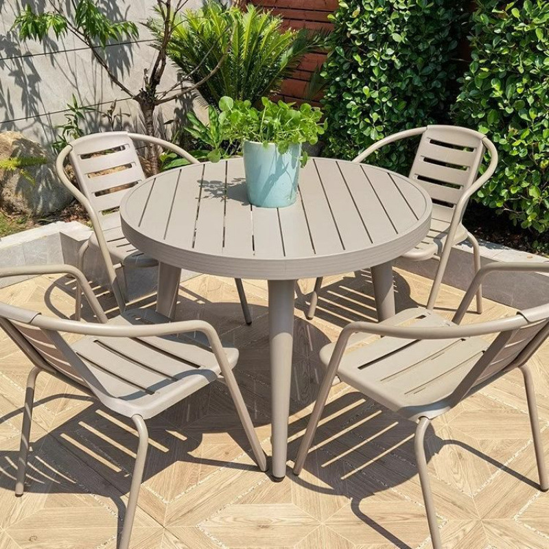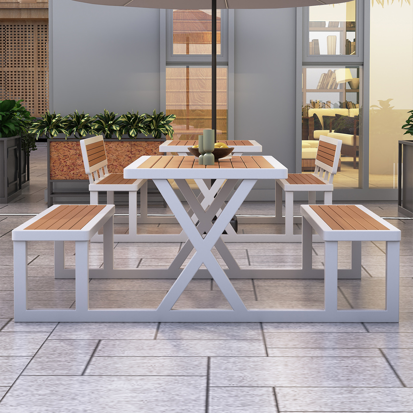 屋外プラスチック木製テーブルと椅子の組み合わせ屋外中庭防錆木材レジャーカフェバルコニー屋外庭園アルミアートテーブルと椅子