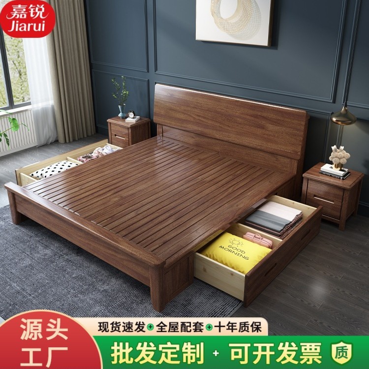 中国式胡桃木1.8m主臥貯蔵ダブルベッド現代シンプルなサイズの家庭用賃貸住宅の実木ベッド