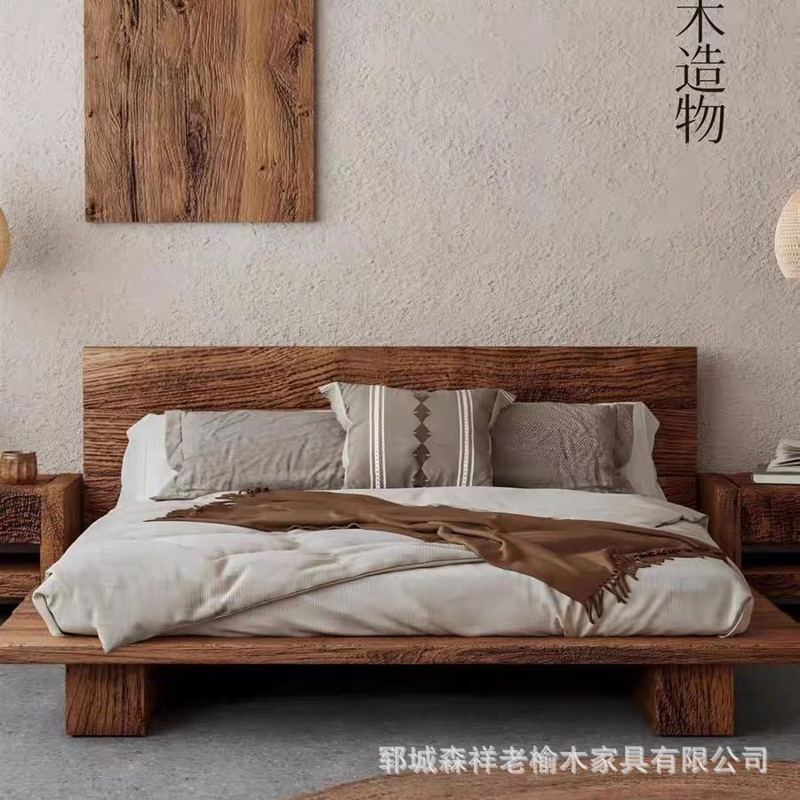 B&B 無垢材ベッド わびさびスタイル ダブルベッド 風化した古いニレ材 ホテル ビッグベッド モダンな寝室 マスターベッドルームベッド