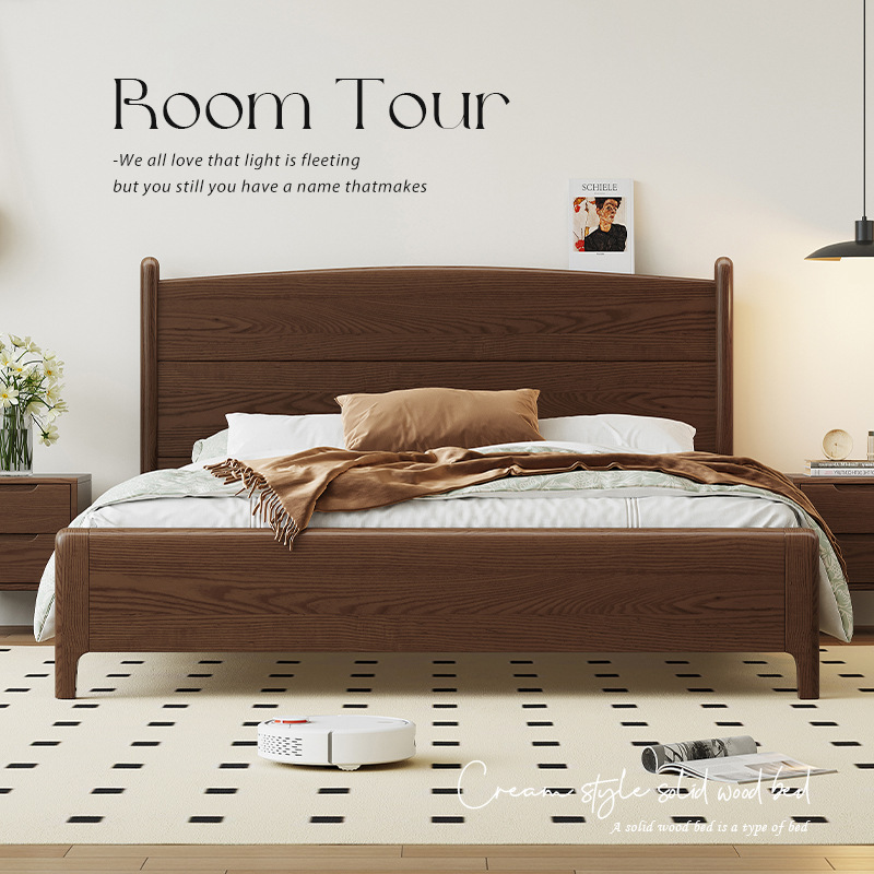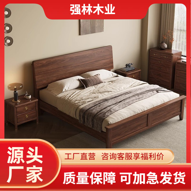 レトロ軽豪華北欧黒胡桃木実木床原木主臥現代シンプルツインベッド大型ベッド1.8m