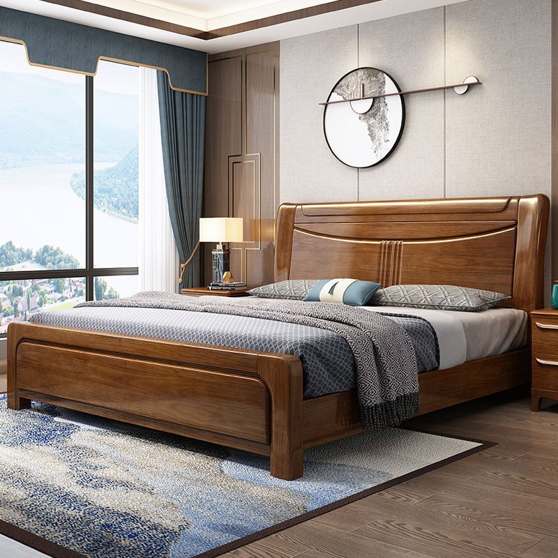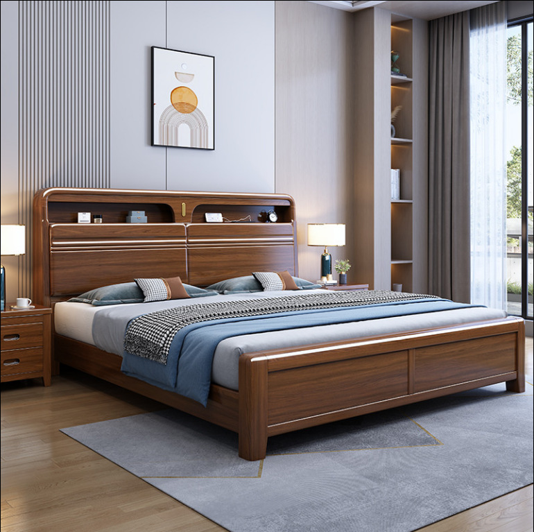 クルミ材色の無垢材ベッド 1.8 ダブルベッド 寝室 モダン シンプル 中国風 1.5m 引き出し収納ベッド 彫刻付き