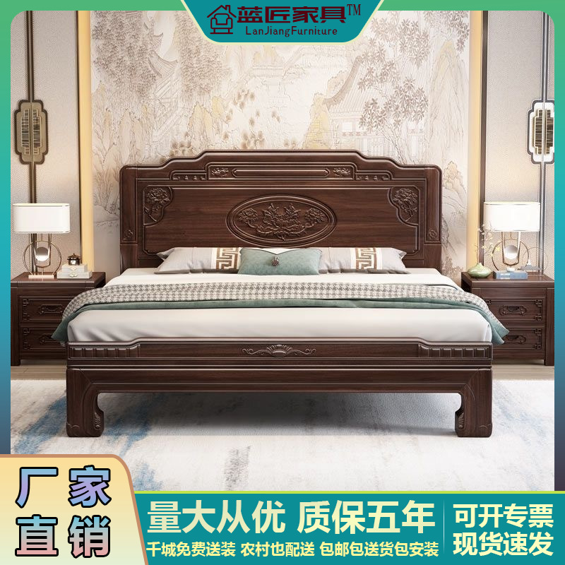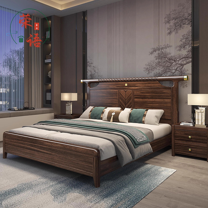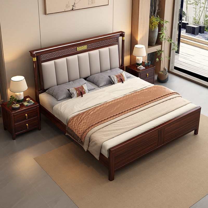 新中国式烏金木実木床1.8メートル主臥別荘ツインベッド1.5m高箱貯蔵寝室家具