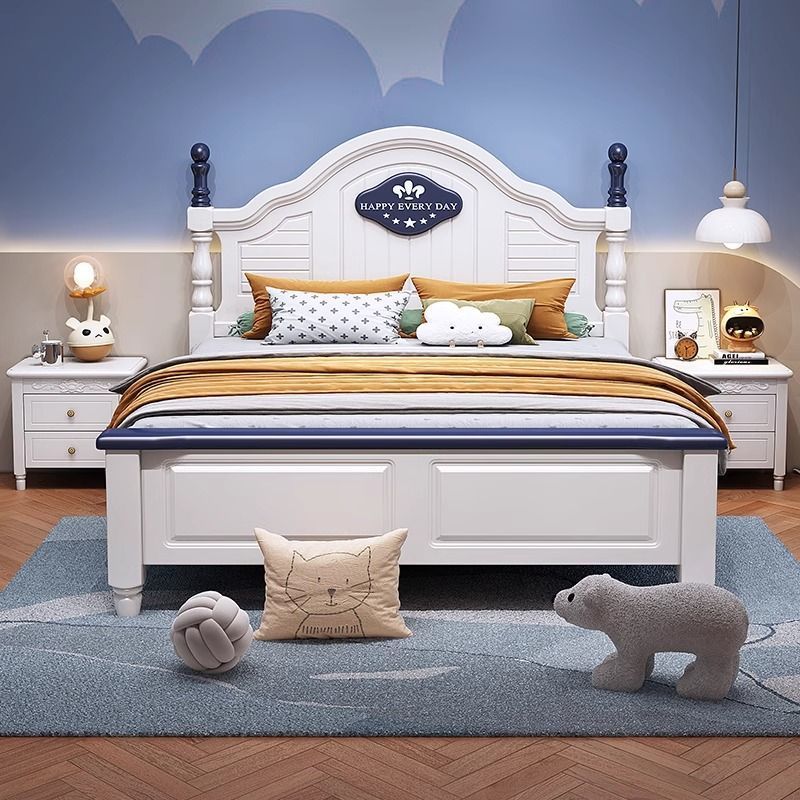 アメリカンパストラルスタイルの白い子供用ベッド無垢材のベッドモダンでシンプルなホームベッドベージュのライト高級マスターベッドルームベッド
