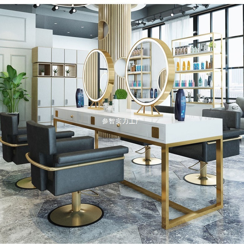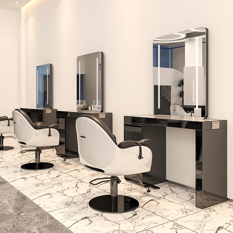 。インターネット有名人のヘアサロン発光大理石デスクトップ理髪店ミラーテーブルヘアサロンライトキャビネット一体型ヘアミラー