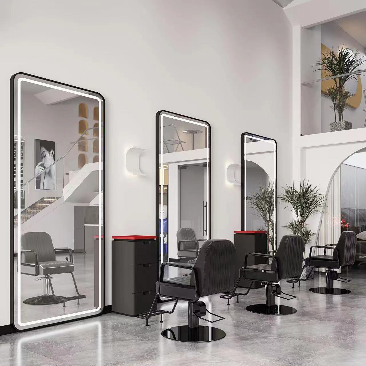 理髪店ミラーテーブルキャビネットLEDフロアヘアミラートレンディなヘアサロンシンプルなヘアカットチェアライト付き