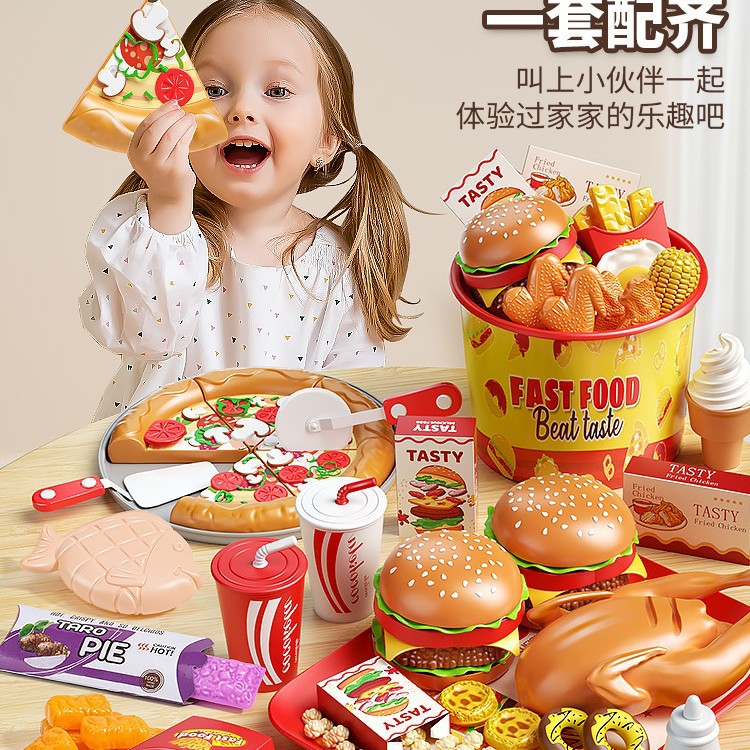 子供の益智のおもちゃのままごとのファーストフードのハンバーガーの女の子の誕生日のプレゼントはフライドチキンのフライドポテトのピザのセットをシミュレーションします。