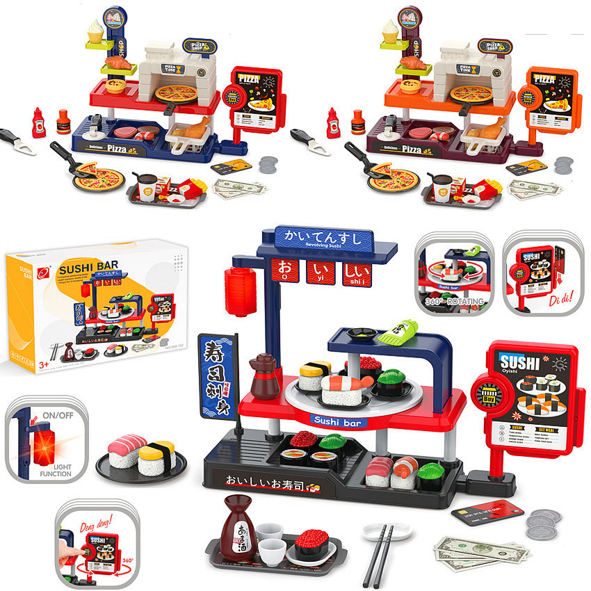 国境を越えたシミュレーション食品寿司ピザセットスーパー台カードレジで買い物をして子供のままごと玩具を焼く