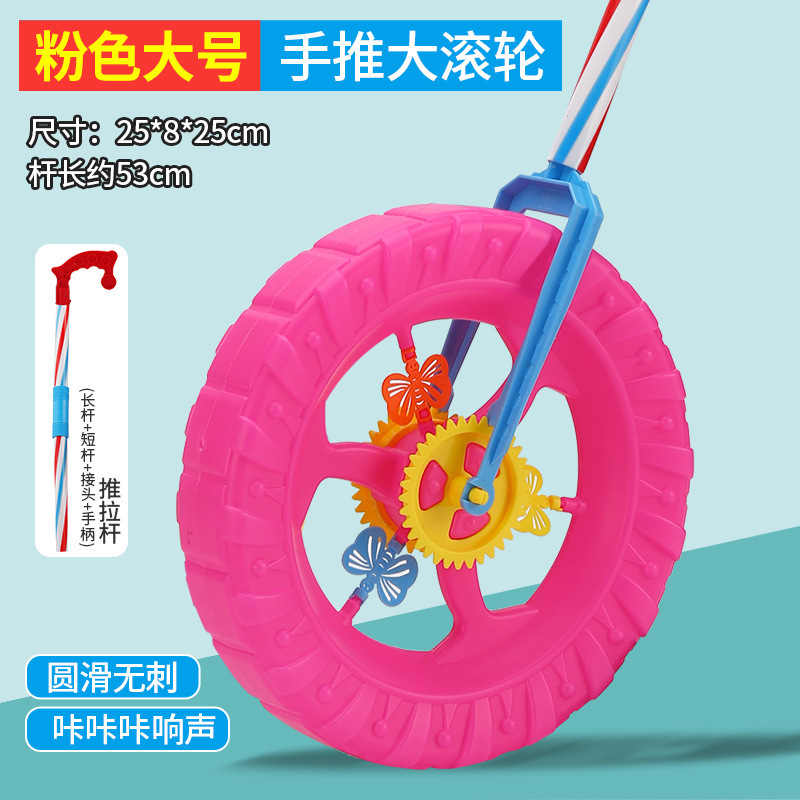 大きな手で車輪を押します。子供は歩行車のおもちゃの鈴を押します。