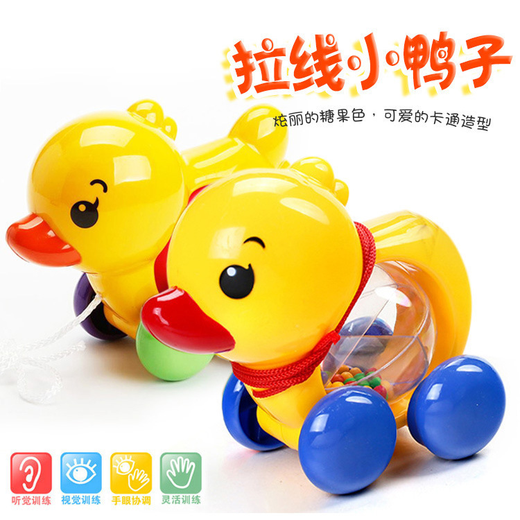 アヒルの糸を引くアヒルのひもは赤ちゃんを誘って子供のおもちゃのアイデアを引っ張ります。