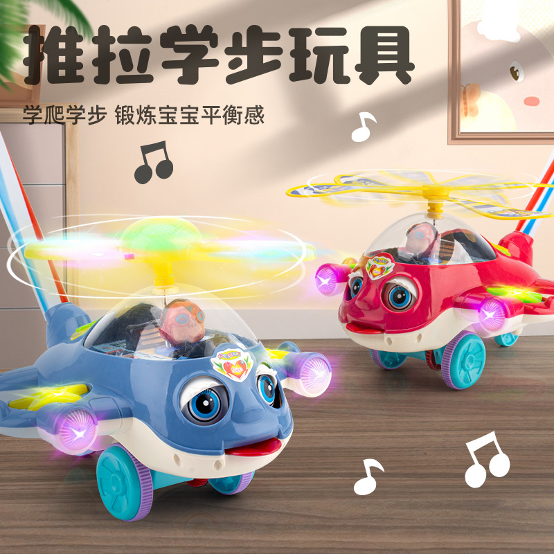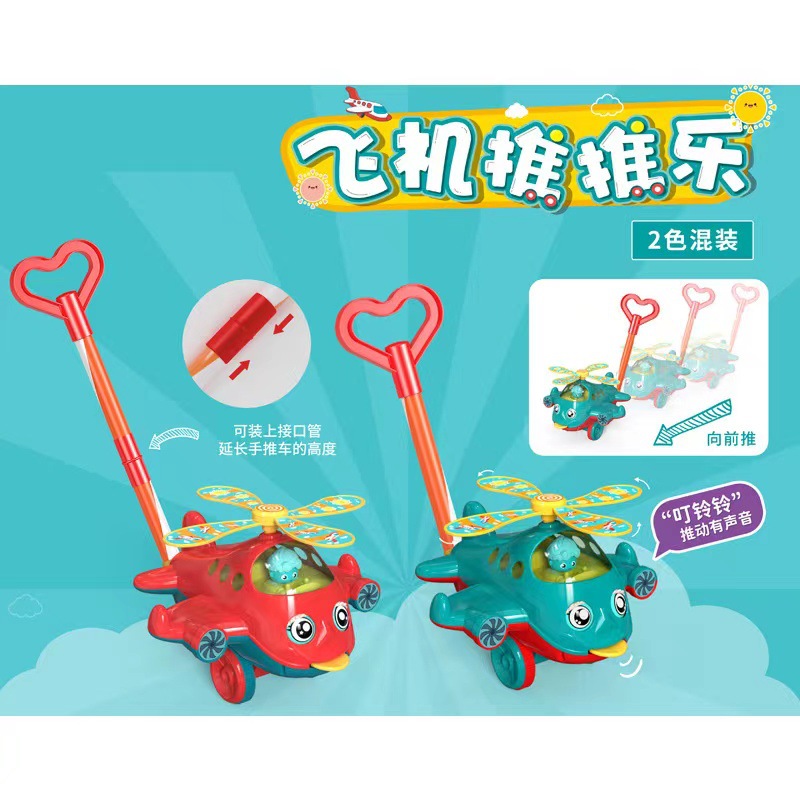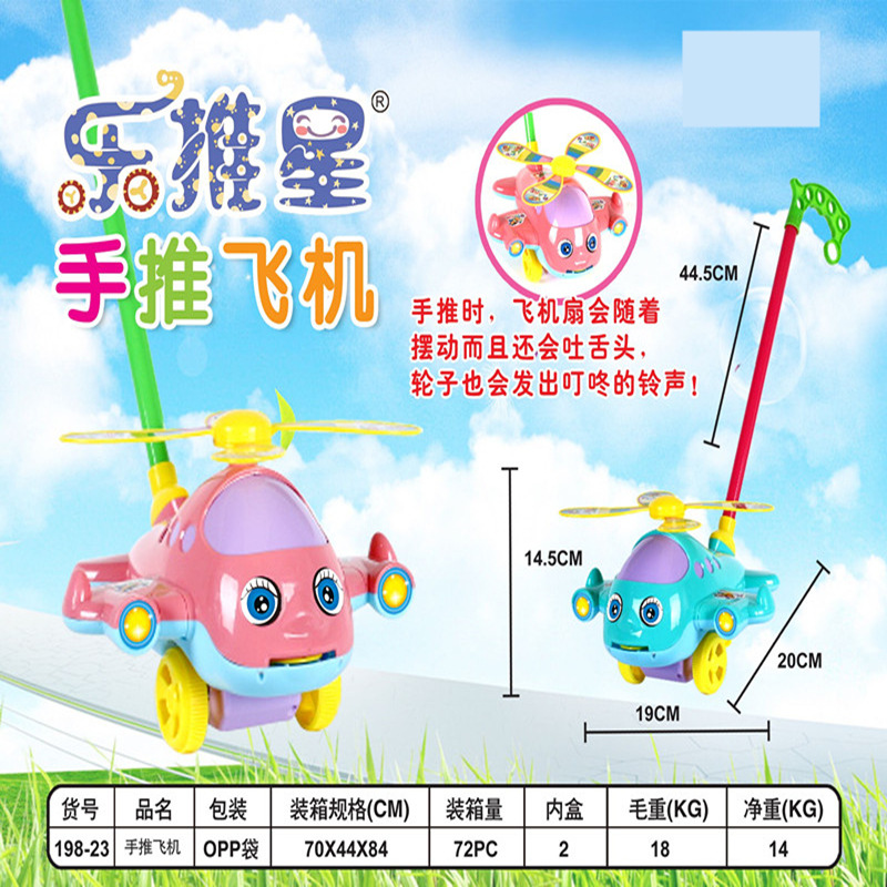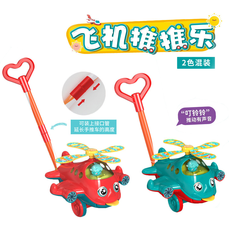 198-23子供の趣味は飛行機のおもちゃのウォーカーを押して舌を吐いてベルを鳴らして翼を回転させます。