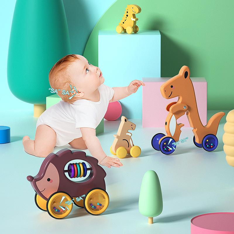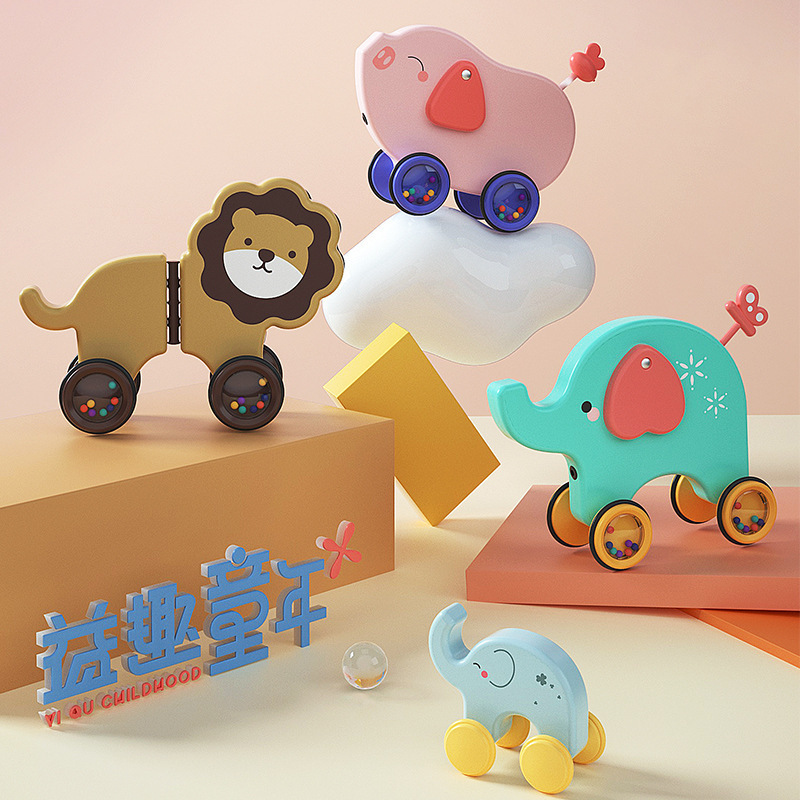 子供はおもちゃの車を引っ張って縄を引いて動物の車の赤ちゃんの益智を牽引します。