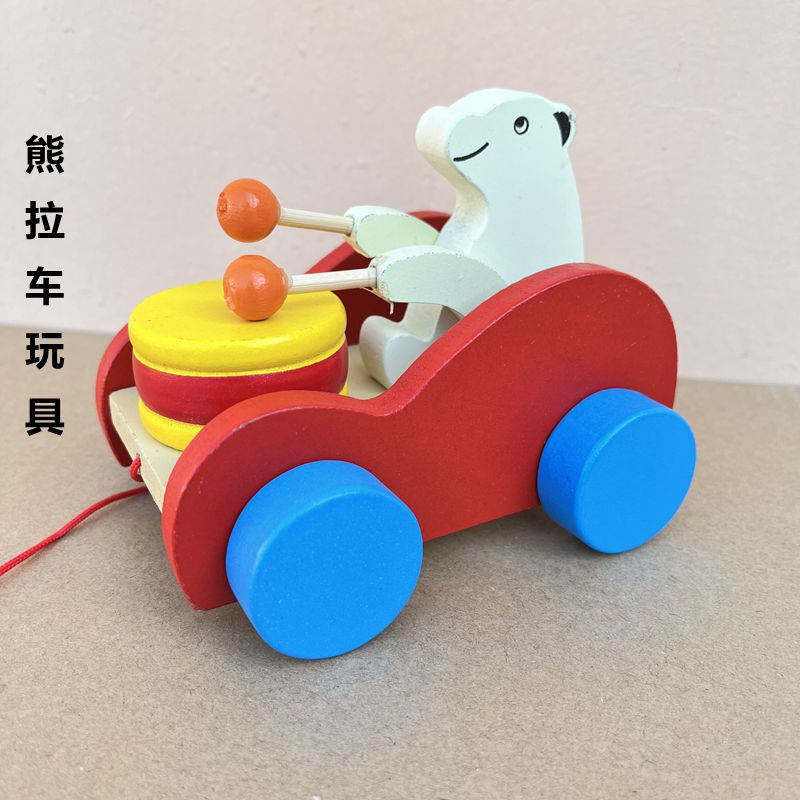 木の熊は車のおもちゃのホッキョクグマを引っ張ります。