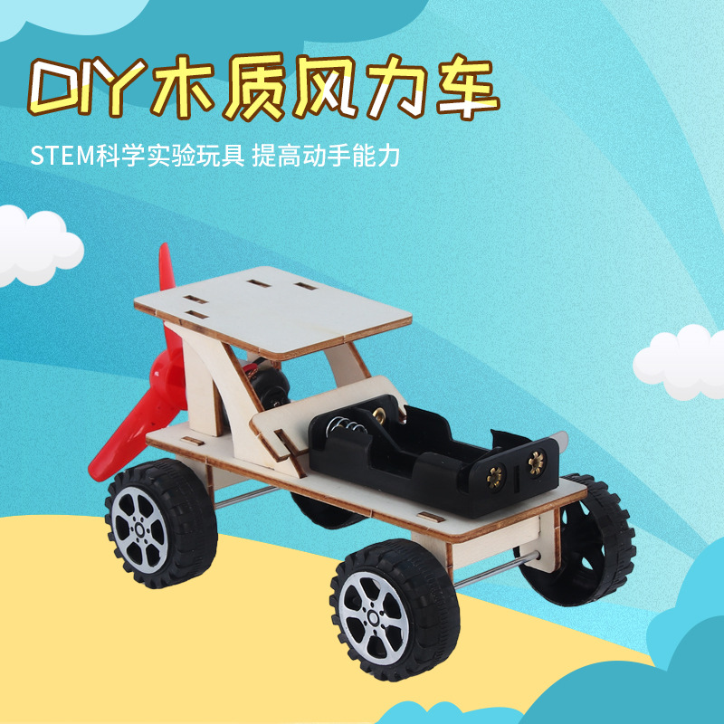 木の風力車の子供の手作りの組み合わせのおもちゃの車の組み合わせの種類のオフロード車のdiyのおもちゃの小さい製作材料は包みます。